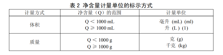 4.1.5.3 凈含量的計量單位應(yīng)按表 2 標示。