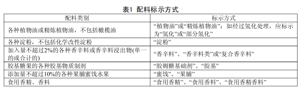 4.1.3.2 下列食品配料,可以選擇按表 1 的方式標示。